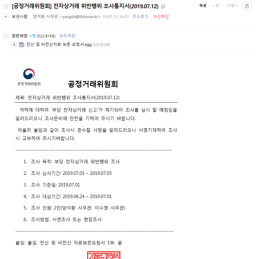 공정거래위원회 사칭 피싱 메일이다.